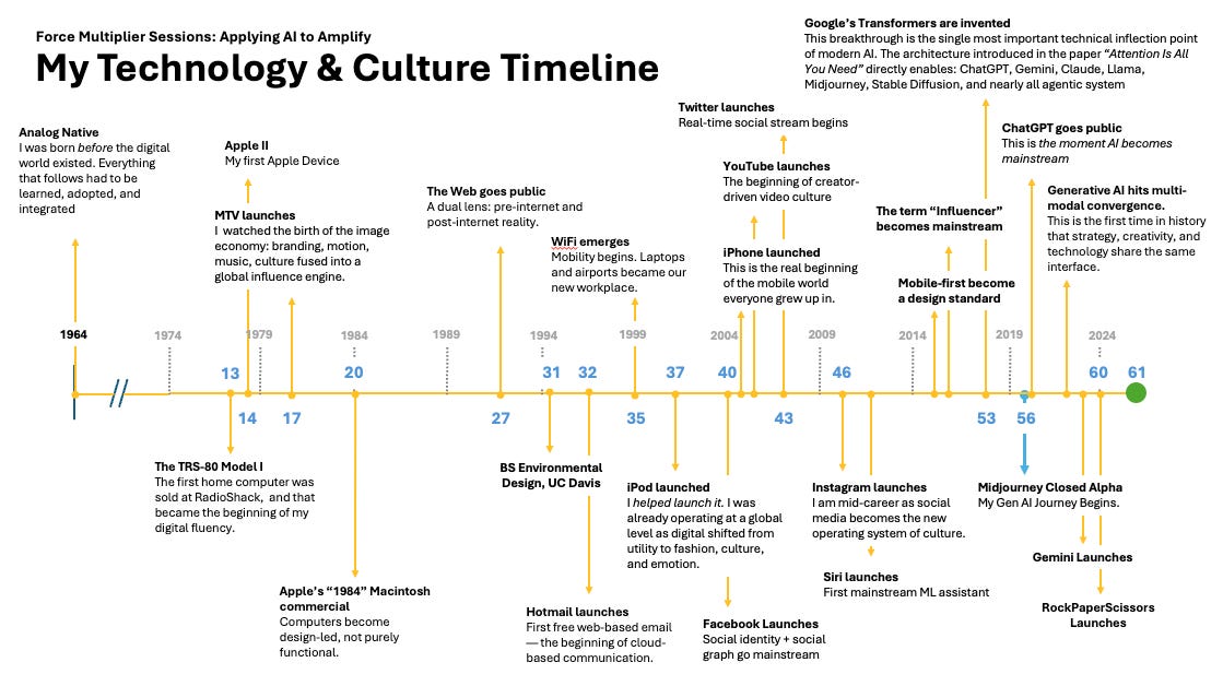 During the workshop, I shared a timeline of my life — not a sentimental scrapbook, but a map of the cultural and technological frontiers I’ve lived through. The TRS-80 at RadioShack. The Macintosh “1984” ad. MTV. Hotmail. The first iPod. The early days of social media when the future shifted from linear to generative. The moment the iPhone quietly rearranged the architecture of our behaviour. And the day transformers were invented — arguably the single most consequential technical breakthrough of the century — which set us on the path to the present moment, a moment in which intelligence is no longer a scarce resource.