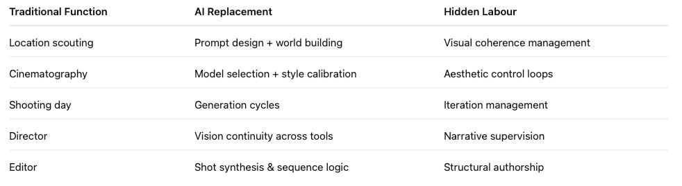 Traditional production budgets have always been dominated by material logistics — the cost of organising people, equipment, locations, time, and physical execution. AI production changes that balance entirely. The centre of gravity shifts away from the orchestration of matter and toward the orchestration of thought. What begins to dominate instead is cognitive systems work: conceptual architecture, visual world logic, prompt design at narrative scale, model selection and testing, style continuity, multi-tool coordination, generation supervision, version control, review governance, narrative integrity, and brand risk management. The physical machinery recedes. The mental machinery expands.